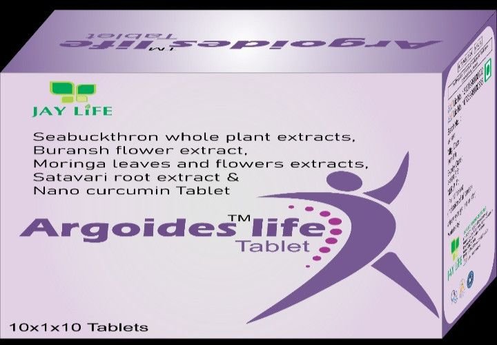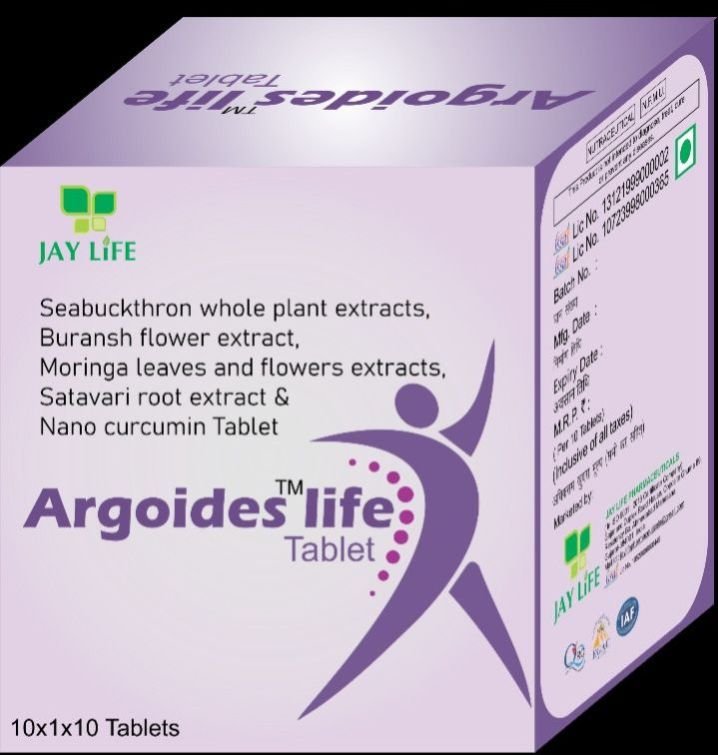 The image shows the packaging for Argoides Life Tablets, a herbal or nutraceutical supplement from Jay Life.